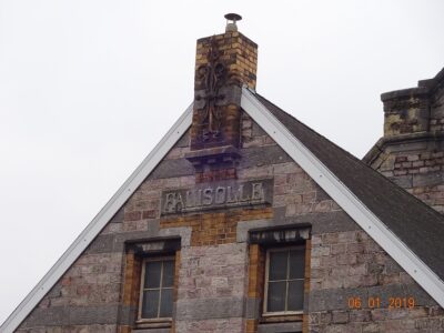 Le bâtiment en pierre bleue est composé d’une partie centrale à 3 travées avec un étage et un étage mansardé, entourée d’une aile basse à 4 travées et d’une aile basse à 3 travées. Il est devenu un commerce de quincaillerie.