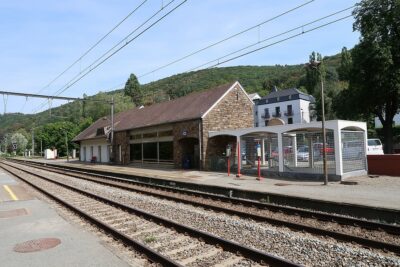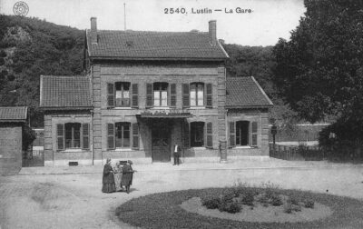 Bienvenue à Lustin! La petite gare, point d’arrêt non-gardé aujourd’hui, fait partie de l’entité de Profondeville. Son histoire remonte au XIXe siècle, du temps de la compagnie du Nord-Belge à l’origine de la ligne vers Givet. Le bâtiment des voyageurs à Lustin était identique aux autres construits par le « Nord-Belge », notamment celles de Jambes, Dave, Godinne, Yvoir et Hastière. Elle abritait le block 4 de la ligne. La station été notamment équipée d’un abri pour les voyageurs sur le quai vers Namur. Une voie de cour, équipée de trois culs-de-sac, desservait la cour et le hangar aux marchandises où transitaient les denrées destinées au village et aux entreprises locales. La cour, le quai à bestiaux, les espaces du hangar et de la lampisterie ainsi que le jardin du chef de gare ont laissé l’espace à un vaste parking. La cabine de signalisation du block 4 se situait à côté du bâtiment principal. Une deuxième cabine de signalisation, installée près du PN 106 et de maisonnette, gérait la sortie de la gare en direction de Dinant-Givet.