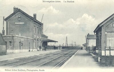 La station de Mévergnies-Attre, dont la première dénomination était « Chièvres-Attre », est située à 1,5 kilomètre de celle de Brugelette, sur la ligne 90. La gare proprement dite fut construite dans les années 1890 suivant le modèle classique de l’Etat belge, avec une partie centrale avec étage pour l’appartement du chef de gare, deux ailes pour les salles d’attente et des guichets, le service de la voie… Une cabine était installée dans le bâtiment principal pour contrôler, entre autres, le passage à niveau (PN 17). L’activité économique locale justifia la construction d’une vaste cour aux marchandises, d’un hangar, d’un gabarit et d’une rampe de chargement à laquelle aboutissait deux voies en cul-de-sac. La sucrerie locale fut raccordée à la gare jusqu’en 1953. Des wagons chargés des pavés des « Carrières de gré de Attre » de M. Declercq situées à quelque trois kilomètres de la station arrivaient également en gare où les pavés étaient stockés dans la cour aux marchandises avant d’être transbordés dans les wagons de chemin de fer.