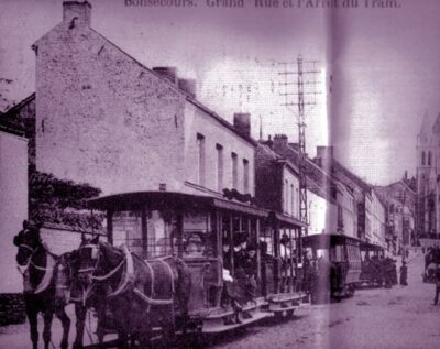 Un mode de transport nouveau est arrivé à la station de la Buissière le 1er mars 1967. Les voitures sont tractées par des chevaux, deux ou trois en fonction des besoins. D’où le nom de « tram à k’vaux ». Le tramway est un moyen de transport privilégié par les pèlerins et les touristes se rendant à Bonsecours, à deux kilomètres de la station de Péruwelz. Sécurité, rapidité, à moindres frais, et par tous les temps! Il en coûtait 10 centimes pour se rendre de la station à l’église, 25 pour aller jusqu’à Bonsecours. La ligne de tram fut inaugurée le 30 mai 1880. Le 28 janvier 1910 allait naître ne nouvelle société, « Les tramways électriques de Péruwelz et extensions », pour l’exploitation d’une ligne entre Péruwelz et Bonsecours et de Péruwelz (église) à la frontière française. La nouvelle société n’a pas créé la ligne et l’exploitation, concédée aux Labouverie, continua avec des chevaux. La traction chevaline fut remplacée par la traction à vapeur pendant la premier guerre. Les rails, à écartement plus étroit que les 1,440 m du début, furent modernisés. L’après-guerre allait sonner le glas de tram et de ses « k’vaux ».
