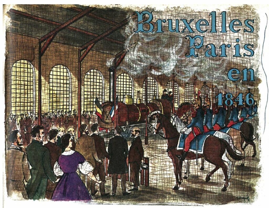Voyager en train entre Paris et Bruxelles est aujourd’hui presqu’un jeu d’enfant. Une vingtaine de trains font, chaque jour, la jonction entre les deux capitales. Les directs « Eurostar » quotidiens demandent moins de 1h30 (record 1h22) de temps de trajet. Le « TGV Inoui », via Lille, nécessite environ 2h15, avec correspondance à Lille Flandre/Europe. Avec le train à bas prix « Ouigo », via Quévy, il faut, depuis le 18 décembre 2024, environ 3 heures pour effectuer la liaison via le réseau classique, avec arrêts intermédiaires à Mons, Aulnoye-Aimeries et Creil. Un bond en arrière dans l’histoire ferroviaire nous dépose en juin 1846, au temps où le train à traction vapeur mettait 12h30 d’une capitale à l’autre… Plus tard, les Trans-Europe-Express (TEE) ont relié les deux villes dès les années 60. Des trains réguliers ont également fait la jonction entre Bruxelles et Paris. Points de passage frontaliers d’hier et d’aujourd’hui: Quévy, Quiévrain sur le réseau classique, Esplechin sur la Ligne à Grande Vitesse (LGV) 1. (Illustration Le Rail (1/07/1963)