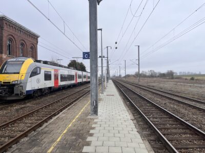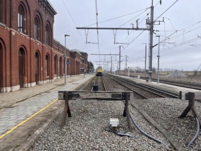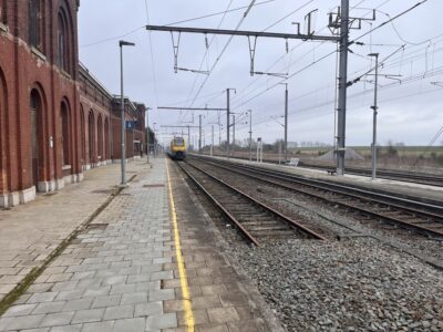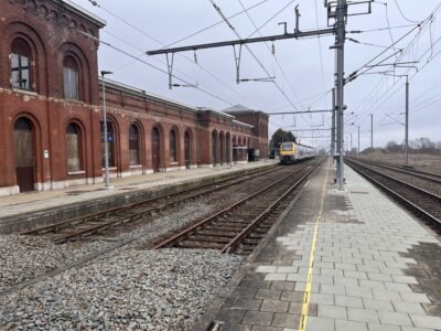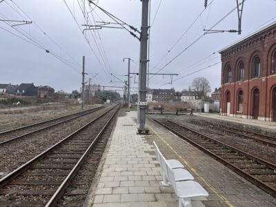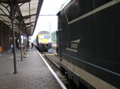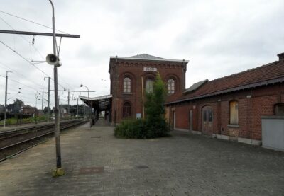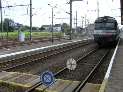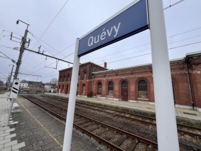 La gare de Quévy a été mise en service le 12 décembre 1857 par la Compagnie du Nord Belge. Un imposant bâtiment principal, composé d’une partie centrale entourée de deux constructions cubiques à deux étages, a été opérationnel en 1865. Une marquise, longue de près de 100 mètres, protège le quai 1. Gare frontière, Quévy disposait d’un bureau des recettes, d’une salle d’attente avec un buffet ainsi que des bureaux pour les services du chemin de fer, des douanes avec une salle de visite et la police des frontières. L’infrastructure ferroviaire était importante. Venant de Blaregnies se situait, à gauche, un faisceau de triage de 9 voies dont 4 à double issue et 5 en cul de sac côté France. A droite, 3 voies en cul de sac aboutissaient au hangar marchandise. Plus à droite encore, la voie latérale voyageur (voie A) également en cul de sac. Au centre, 4 voies principales pour le transit transfrontalier. La gare de Quévy disposait également de deux raccordements. Branché sur la voie 9 du faisceau de triage, les étables de quarantaine étaient destinées à accueillir le bétail importé afin de vérifier les conditions sanitaires. Elles ont été fermées en 1953. Se détachant de la voie A, un embranchement desservait la gare vicinale, située face au bâtiment principal, pour le transbordement des marchandises entre la SNCV et la SNCB. La gare vicinale a été fermée en 1964. En 1963, à l’occasion de l’électrification de la ligne 96, les installations seront adaptées. Les voies 1, 2, 5 et 6 seront rendues commutables 3000V SNCB / 25000 V SNCF pour l’échange des locomotives. Les voies 3 et 4, équipées d’une section isolée, permettront le passage direct des trains assurés avec du matériel de traction polycourant. Cette exploitation complexe était commandée par le B 33 « Tout relais » qui avait remplacé les deux cabines mécaniques (B 33 et B 34). Depuis le 17 décembre 2017, la commande du B 33 a été reprise par le B 27 EBP/PLP de Mons et le personnel supprimé. Les installations ont également été simplifiées, les voies 1 et 2 (devenues B et C) sont désormais en cul de sac, côté France, et alimentée uniquement en 3000 V. Le trafic transfrontalier s’effectue uniquement avec des locomotives polycourant par les voies 3 et 4. La voie A, électrifiée en 3000 V, est toujours en service et utilisée pour quelques trains L. La liaison internationale Bruxelles – Paris via Quévy, n’a pas survécu à la mise en service des trains Thalys via la ligne TGV. Cependant, 2 allers-retours Mons – Aulnoye avec correspondance pour Paris sont rétablis depuis le 9 décembre 2018.