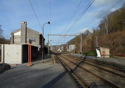 Bienvenue en gare d’Yvoir! Nous sommes sur la ligne 154, entre Namur et Dinant. La gare d’Yvoir a été mise en service le 5 février 1862 par la Compagnie du Nord-Belge sur la ligne qui faisant la jonction entre Namur et Givet (F). Elle est située au km 20,1 entre Dinant et Godinne. Ici se fait la bifurcation vers la ligne 128 dite, aujourd’hui, du « Chemin de Fer du Bocq » exploité depuis 1992 par le Patrimoine ferroviaire et Tourisme (PFT). Cette ligne, ouverte le 1er juin 1907, faisait la jonction entre Ciney et Yvoir. Le « Tunnel d’Yvoir » (1.050 m), jadis un des plus anciens tunnels de Belgique, se situe avant l’entrée en gare, en venant de la ligne 128. La carrière d’Yvoir, toujours en activité, se situe au-dessus de ce tunnel. Dans le courant du mois d’octobre 1940, Hitler circula avec son train spécial en Europe. La nuit du 2l au 22 octobre, il était prévu de l’abriter dans le tunnel d’Yvoir. Le très long tunnel d’Yvoir et toute la colline étaient considérés comme un endroit stratégique par les Allemands… Les Yvoiriens appelleront l’endroit le « Tunnel de Hitler ».